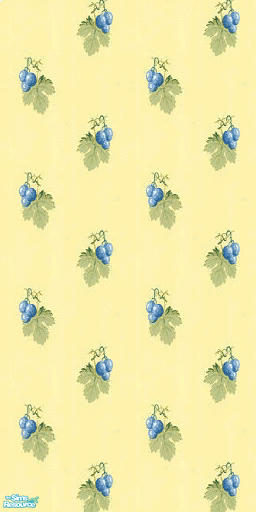 Blue sprigs of grapes atop a pale yellow wallpaper.