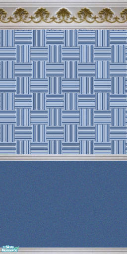 A textured blue base with a blue weave top. Featuring crown molding with gold accents on white and white chair guard and baseboard.