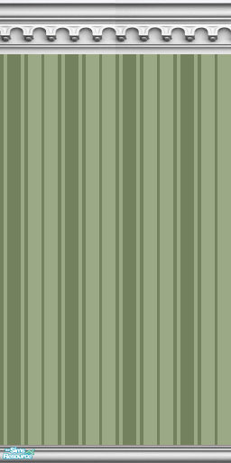 Olive Oxford striped wallpaper is topped by a gothic arch crown molding and matching baseboard.