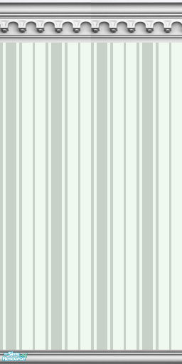 Pale Green Oxford striped wallpaper is topped by a gothic arch crown molding and matching baseboard.