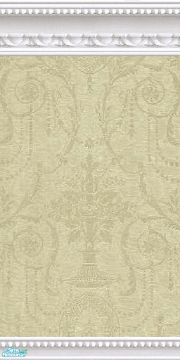 A light green, scrolled damask wallpaper encased in my white marble beaded moulding with egg and dart detail. Please do not reupload. Thanks for downloading, enjoy!