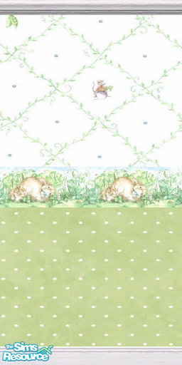 Cute Momma and Baby rabbit in a cabbage patch border. With light green swiss dot wallpaper on bottom and green vine lattice paper with bunnies on top.