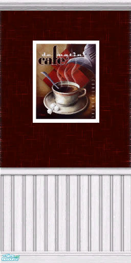 2nd of a set of eight Cafe walls. Wall with cappacino and marshmallows mural top, white panelling base. Mix of rich burgandy/brown walls with white panelling base, molding and Cafe theme murals. Perfect for decorating your cafe, restaurant or coffee house.