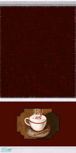 7th of a set of eight Cafe walls. Wall with cappacino mural. Mix of rich burgandy/brown walls with white panelling base, molding and Cafe theme murals. Perfect for decorating your cafe, restaurant or coffee house.