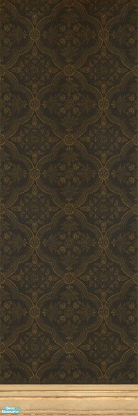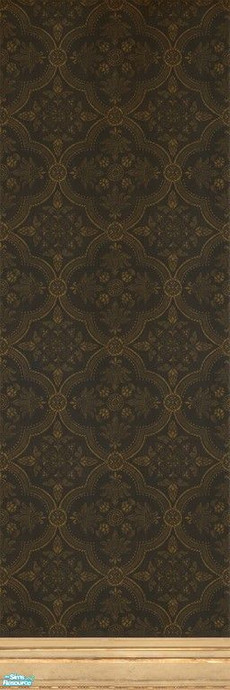 A formal pattern in deep gold on a dark blue background, with moldings that match my Old Cream panels. No longer new or clean, but still beautiful.