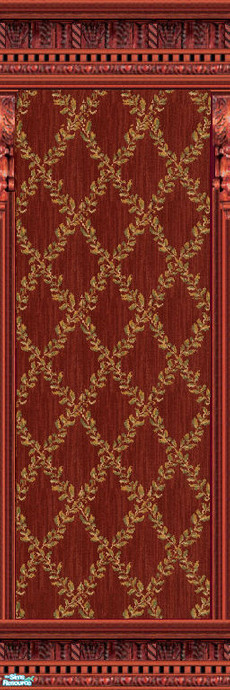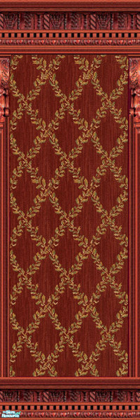 Red and gold leaf trellis pattern make up this wallpaper with ENKE redwood moldings and columns. Please find in the \"Wallpaper\" category. Always TSRAA. Comments always appreciated.