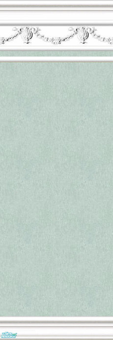 Rope swagged white mouldings hold a mottled aqua blue wallpaper. Matching carpet is included in this set.