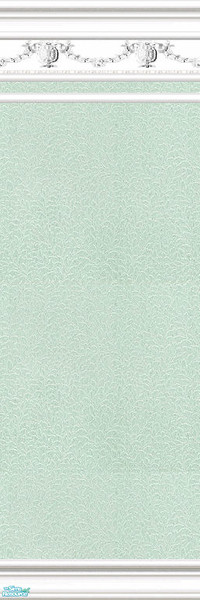 Subtle patterns are imprinted on aqua wallpaper that is held in white, rope and swag embellished mouldings. Please find in the \"wallpaper\" category.