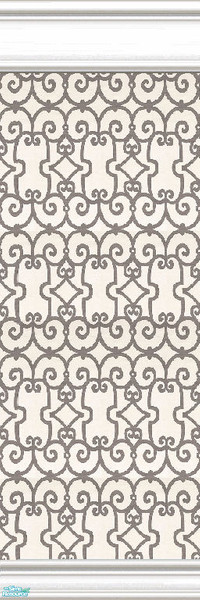 Broad, white moldings hold wallpaper with gray scroll work on a light background. This looks like tile work, so it could be used in bathrooms. Always TSRAA.