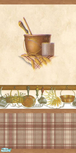 A border of pots and pans on a 2-tone beige and plaid paper