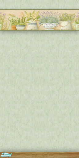 A green wall with a border of plants and a baseboard of medium wood.
