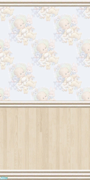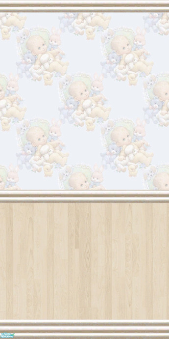 Cute wall in light pine panelling and baby-themed wallpaper. Part of the Precious Bundle Nursery Set by Riverwillows.