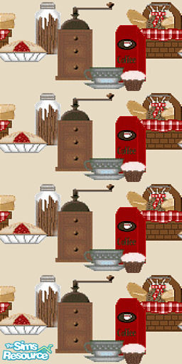 For the country kitchen. Coffee, cupcake, bread ect. in red, tan, blue and brown.