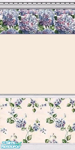 Soft muted background with blue and purple lilacs. Lilac border and white crown, kick and chair moulding.