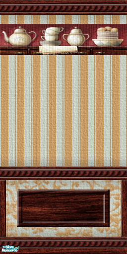 Pale blue - ochre striped elegant wallpaper with wood panel and \"cupboard\" motif.