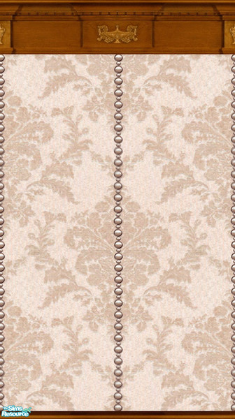 Beautiful antique damask wallpaper, with pink pearls and fancy brownwood wainscoting. Part of the Timeless Living Set by Riverwillows.
