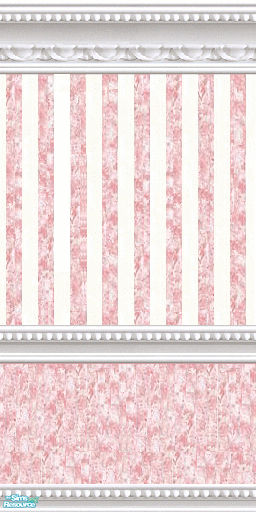 Beaded and carved white marble wainscoting holds ivory and pink textured striped wallpaper. Below the chair rail heavily textured matching pink wallpaper. Enjoy!