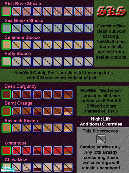 This zip contains only overrides to clean out variations from your catalog (NL has adequate 4 way base walls which will be left intact). Intended for use with my NewWall System trims & moldings. Enter NewWall into the search box under object downloads for a complete selection. By: SKS