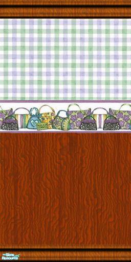 a nice paneled wall along the bottom with a pretty green and blue checkered wall paper at top and purses boarder across the chair rail with matching trimmings. looks great in a business or home