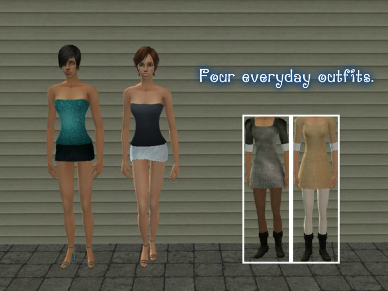 This set consists of four everyday/formal outfits; two with a strapless top & a skirt, & the other two with a dress, leggings, & boots. I only did the textures; I didn\'t modify the mesh at all.