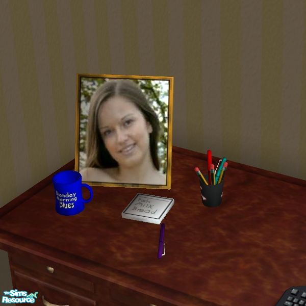 Framed picture, a cup of pens and pencils, notepad, and a coffee mug that your Sim left laying on the desk. Object is intended for you to personalize by substituting your own picture.