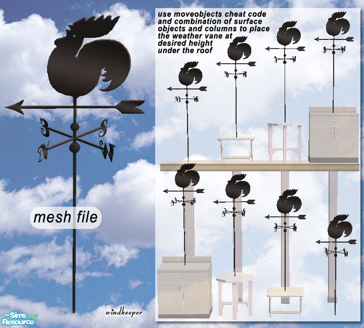 - MASTER MESH - You need to download this one for other weather vanes to work in your game. Place it on the attic floor under the roof so the vane would show up just above the roof. You will need to use "moveobjects on" cheat code for that. Refer to the diagram on the picture for how to adjust its height.