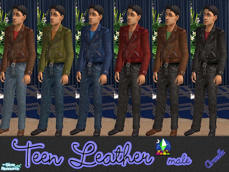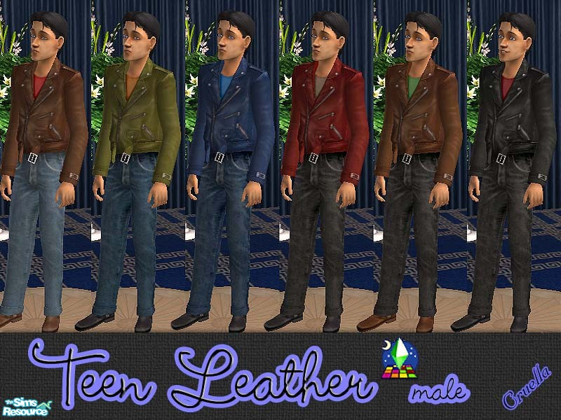 Is your Teen-male Sims sick of the same black color choices in leahter, well look no farther. Now he can choose from 6 different colors with coordinating jeans and boots.