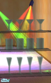 Smokey black glass shelves on mirror with assortment of glasses: martini, highball and champagne flutes in blue glass.