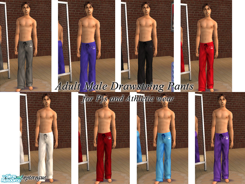 New colors of drawstring pants for the adult guys. Based on the Young Adult drawstring pants, but these are available not only as sleepwear, but as athletic wear! If there's another color you want, let me know. :) Comes in grey, blue, black, a lighter red, white, dark red, lt. blue and a bluish-purple.