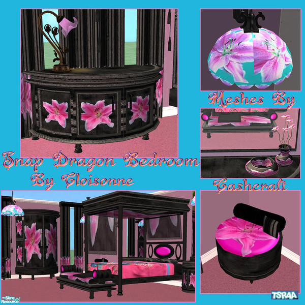 Title inspired by the dragon embroidery bedding.Recolor of Cashcraft's Asian inspired bedroom meshes.Lillies mainly being the theme.