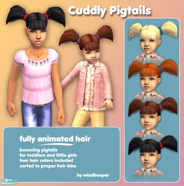 Fully animated bouncing pigtails for toddlers and little girls. Hair sorted in proper hair color bins.
