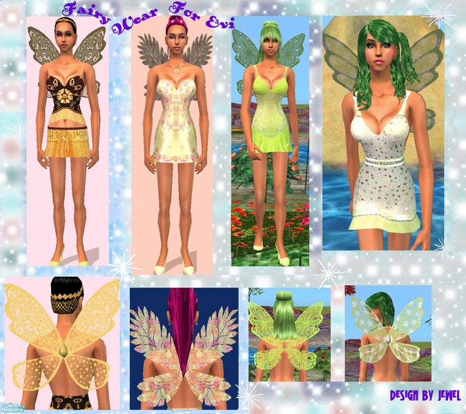 Four beautiful dresses for your sexy sims with fairy wings to match. Try them with Evi's fairy houses!