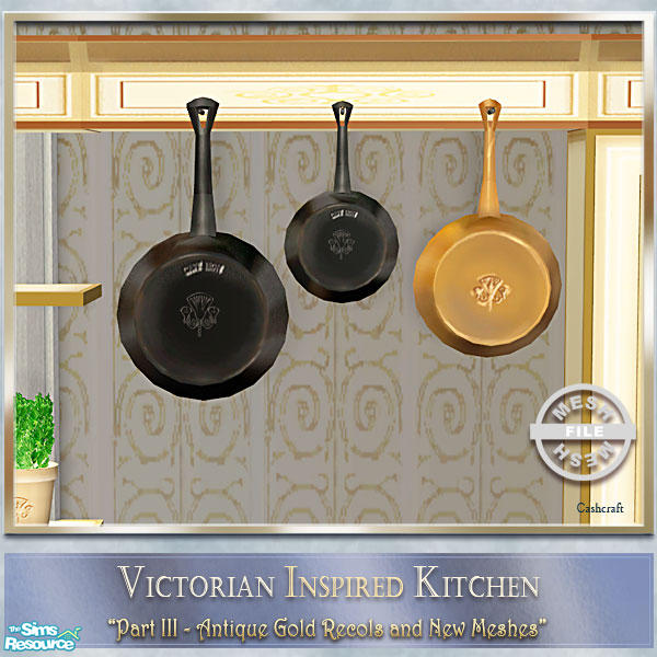**decorative/misc**Part III of my Victorian Inspired Kitchen, features antique gold recolors of my kitchen cabinets, and counters. The set also includes 4 new meshes, a hanging shelf with cookware, a shelf with potted herbs, a vintage sink, and a shelf with jars of canned goods.