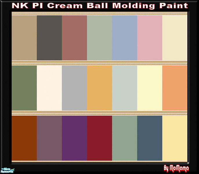 A set of 21 paints (couldn't make up my mind on peach vs. brown again) to go with the 20 shades of everything else. Featuring a cream-colored ball crown molding and matching baseboard.