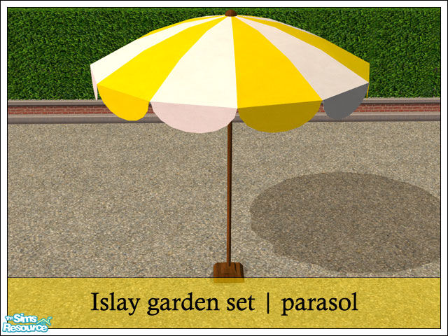 Large parasol with a wooden base, to be used on it's own or in a table. Can be placed without cheats. Shade and base can be recolored separately.