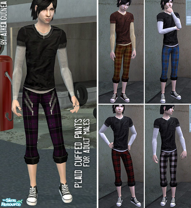 Plaid cuffed pants with sneakers for Adult Males. Set includes five full outfits; requires mesh 'Cuffed Pants with Sneakers for Males (AG11)'. Base game compatible.