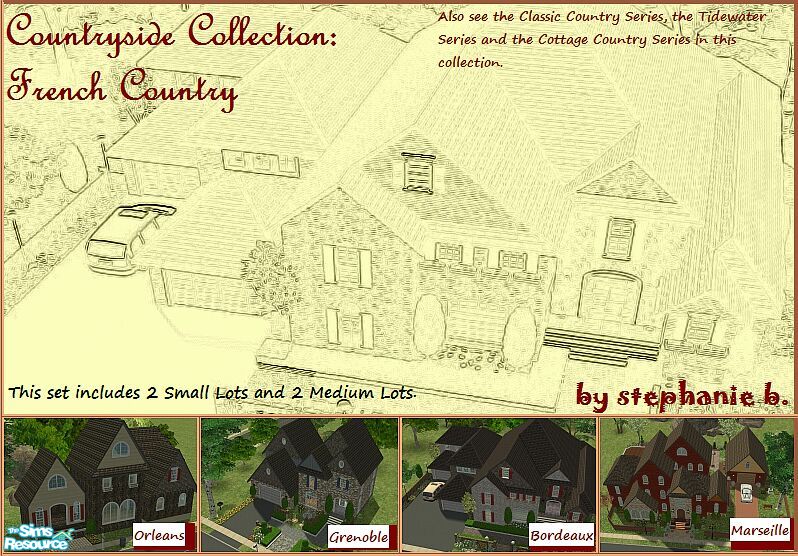 The French Country Series is a part of the Coutryside Collection. It includes 4 houses ranging from 15,000 simoleons to 150,000 simoleons. The houses include Orleans, Grenoble, Bordeaux, and Marseille. Be sure to download the other Countryside homes! Enjoy!