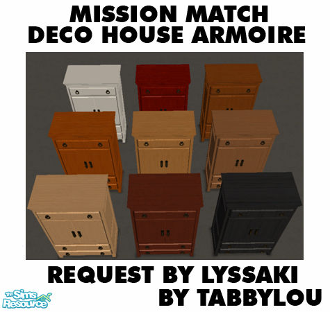 Requested by LyssaKi. She wanted an armoire to match the Mission Style OFB furniture. We both thought the Decorative House Armoire was the closest. So, here they are. Metal recolors require CEP. Enjoy!