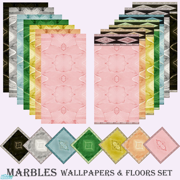 This set includes 21 items : 14 walls with and without paneling and their 7 matching floors. The walls' type is "Poured" and the floors' type is "Tiled". The sound type of the floor is "Marble". The colors used for walls and floors are : Black, Gold, Silver, Green, Light Blue, Orange and Rose. Hope you'll like this set. Enjoy!
