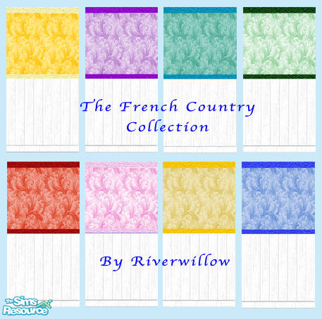 A beautiful set of wallpapers, with subtle fleur-de-lis patterning, against a white wood country baseboard. In 8 delicious colors. Keeping with my nice and cheap policy, these are only 1 simolean! Enjoy and please comment if you like them.