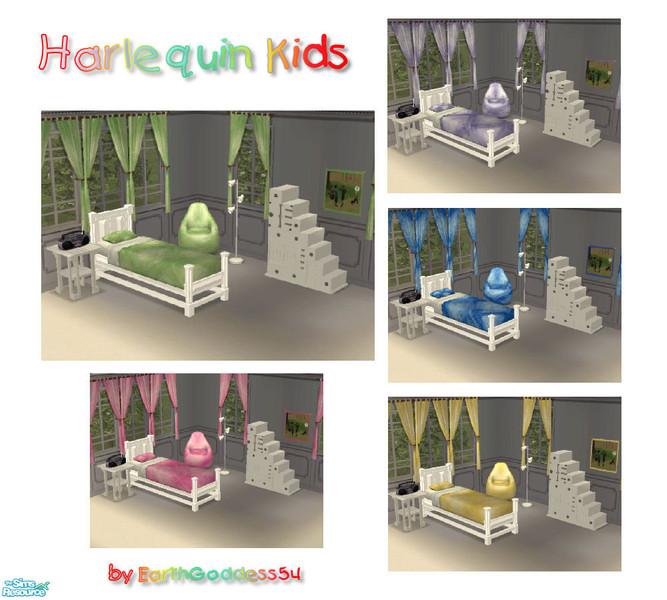 A fantastically diverse bedroom set for kids in white with 5 different accent colors. Every child needs variety, right? Set includes: white bed with 5 different beddings, dresser, end table, lamp, 5 posters, and 5 chairs. Wow! Mix n match or keep it flowering with one color. Enjoy!