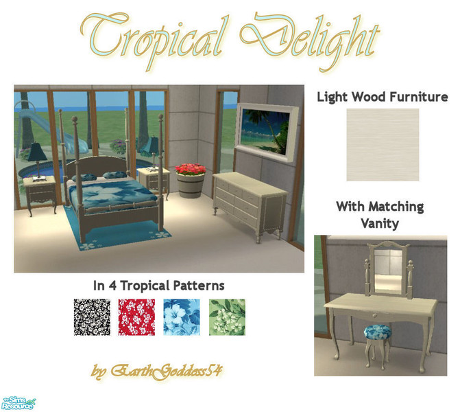 A sinfully luxurious bedroom with a tropical flavor! Perfect for summer...or wishful thinking. Set includes: bed, 4 tropical beddings, dresser, end table, flower pot, vanity, and 4 matching rugs. Enjoy!