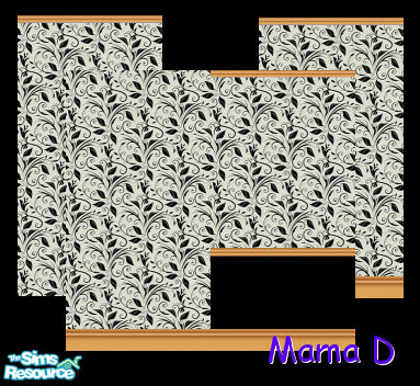A wallpaper with a nice black & white pattern. In a light brown molding. In your choice of top, bottom, double, and chair rail. This set also has matching bedding (Mama D's Beding 0033), and curtains (Mama D's Curtains 0033), see my profile for them.
