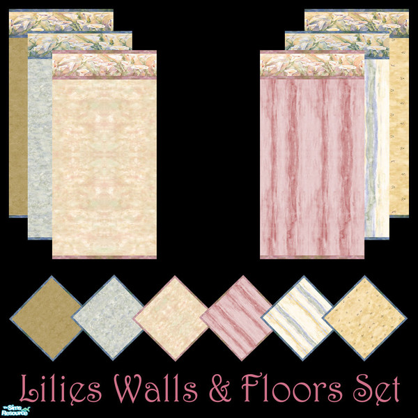 This set includes 12 items : 6 walls and their 6 matching floors. The walls type is "Wallpaper" and the floors type is "Tiled". The sound of the floor is "Marble". The tile repeat is 2X2. Each item cost 20. Hope you'll like the set. Enjoy.