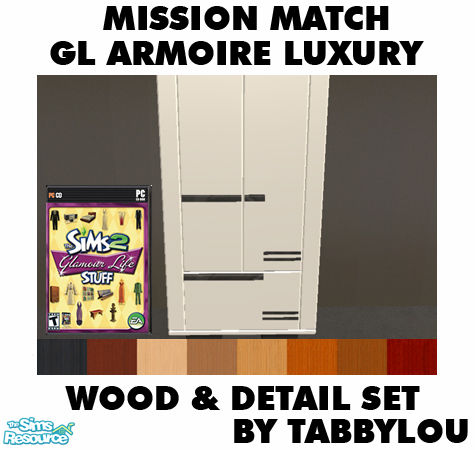 Recolor of Glamour Life Luxury Affluent Armoires to match the mission style furniture woods & my wood recolors. This set includes wood & detail recolors. Request by lupusdragon. Requires Glamour Life Stuff Pack. Enjoy!