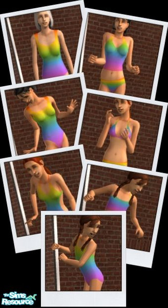 Matching rainbow swimwear for mothers and daughters of all ages. Child, Teen and Adult have two pieces and one piece bathingsuits. Elder only has one piece.