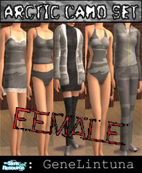 A 5-piece set of clothing with arctic camouflage print. For Female [of course]. No meshes are needed, Enjoy!