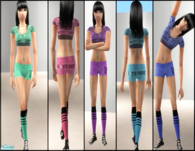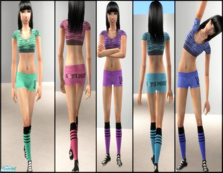 a set of 5 teen gym outfits. all have a pair of victoria secrets love pink shorts a cropped hoodie top stripey socks and cons. i hope you like no mesh needed!!