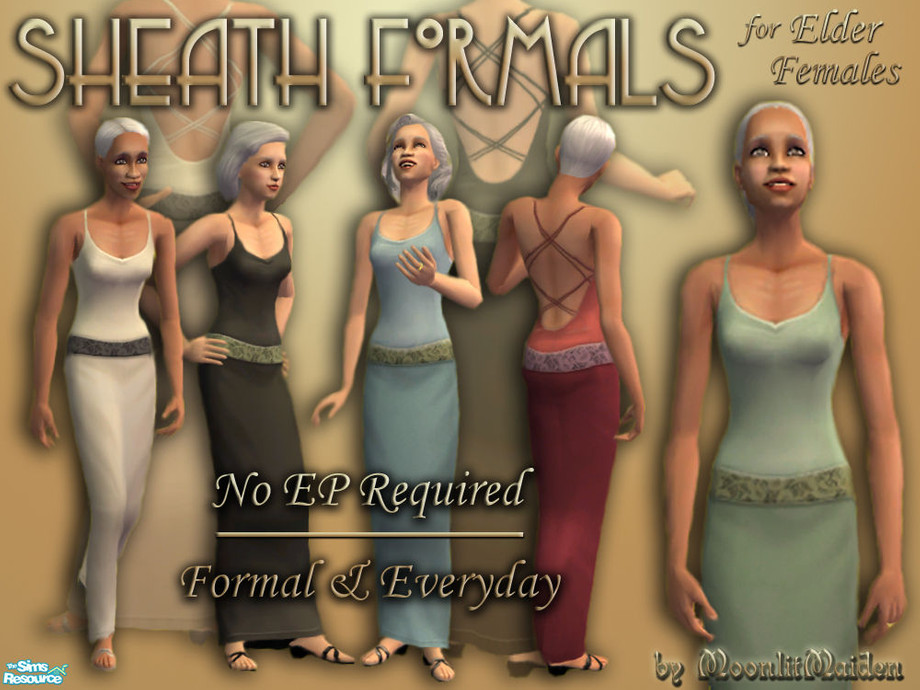 Tired of few decent clothes for elders? Expand your older Sim\'s wardrobe with recategorized adult clothing! Sims still walk like elders, but no more sagging, paunches or fat hips. Gray is beautiful! This set includes the sheath formals from the base game, categorized for formal and everyday.