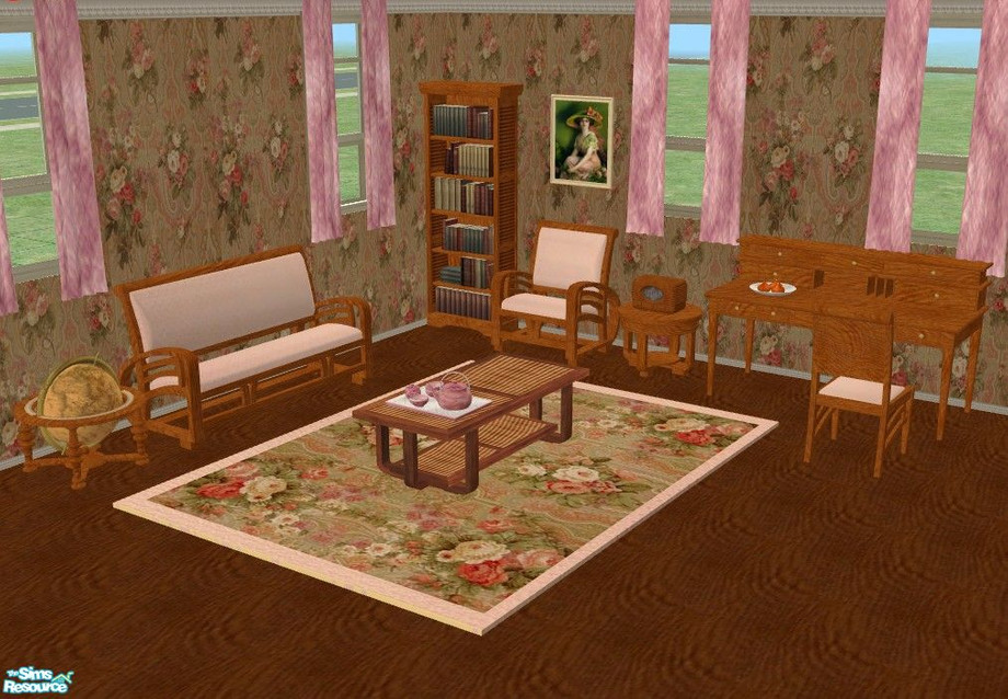 Lovely recolor of Caravan Sims Louisiana Living Room, featuring Victorian Roses and pink shades, and made expressly at the request of Altanna here on TSR, by Riverwillows.